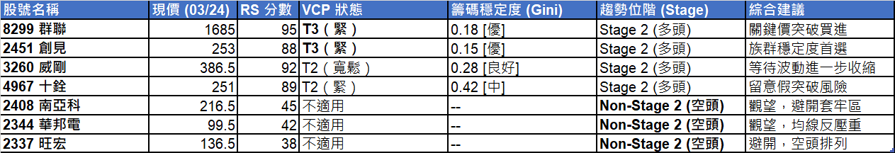[cite_start]在量化模型中,8299 群聯 與 2451 創見 展現了教科書級別的 VCP 形態 [cite: 6, 7]。