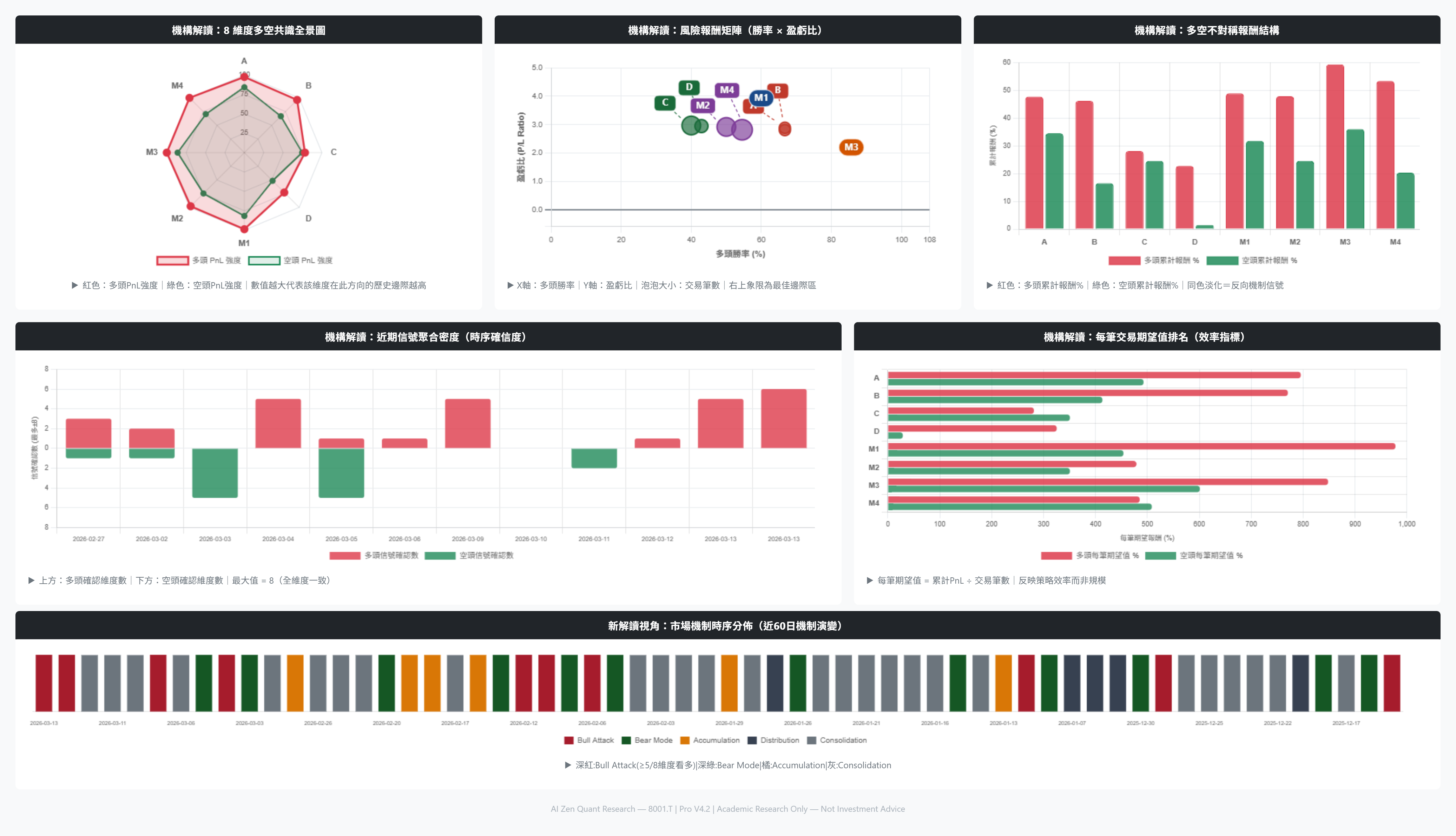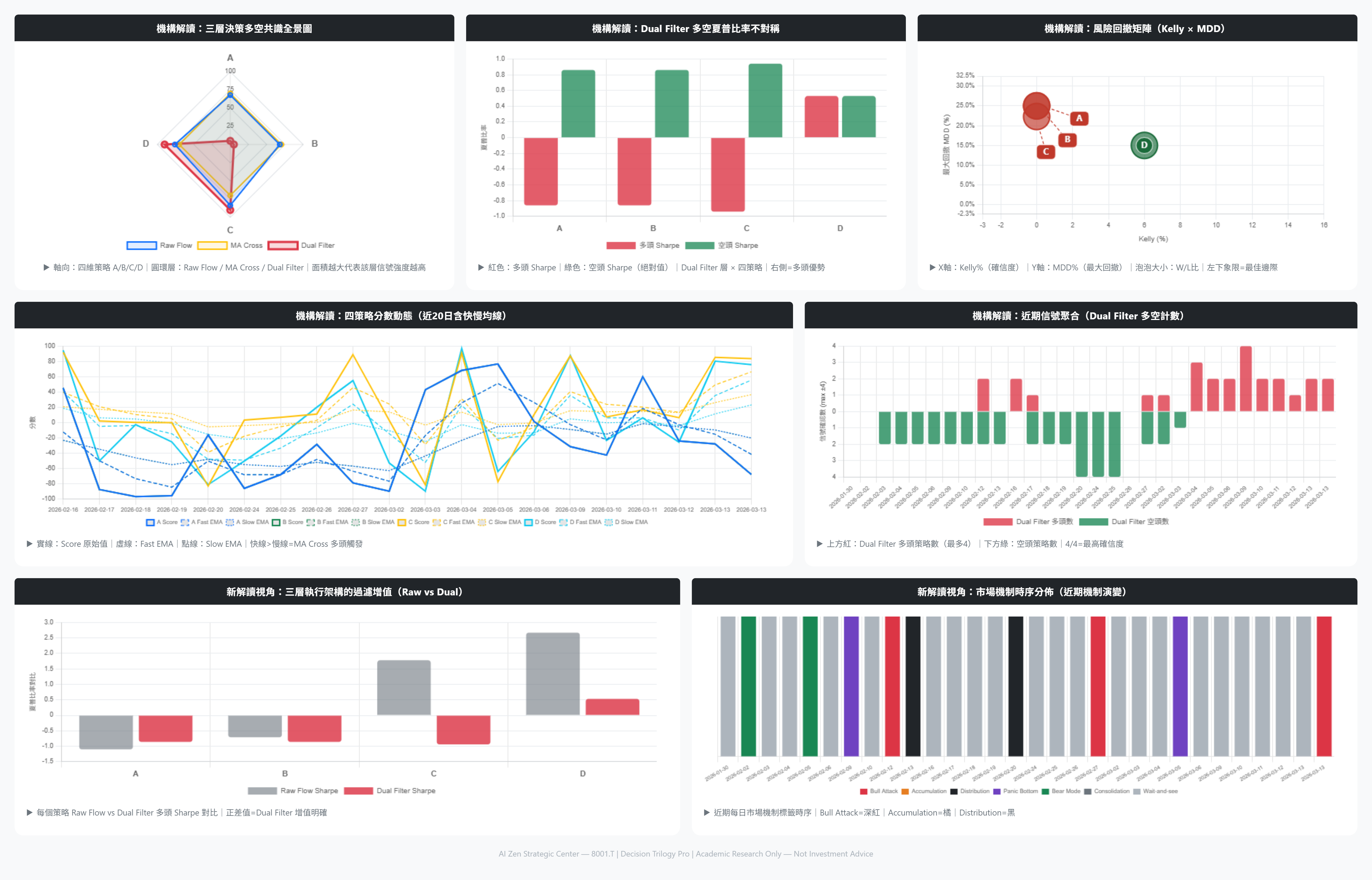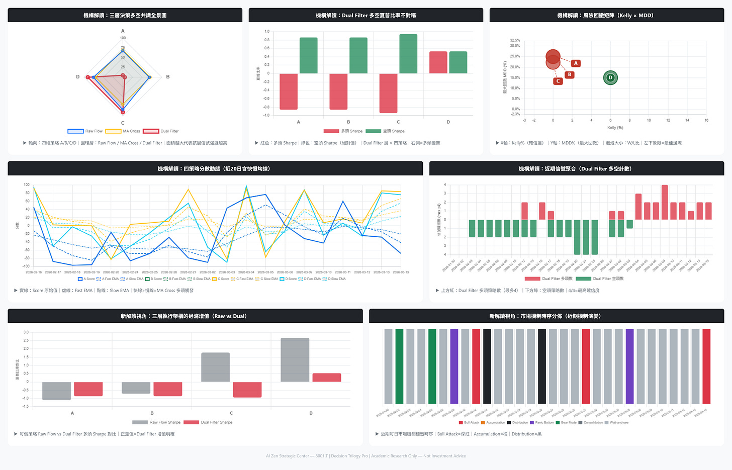 動態趨勢追蹤 (Dynamic Matrix) 與 市場機制濾網 (Regime Matrix): 目前處於中性/短線偏空的戰術姿態(評分 -67.9) 。這反映了快速指數平均線出現健康的短期降溫。