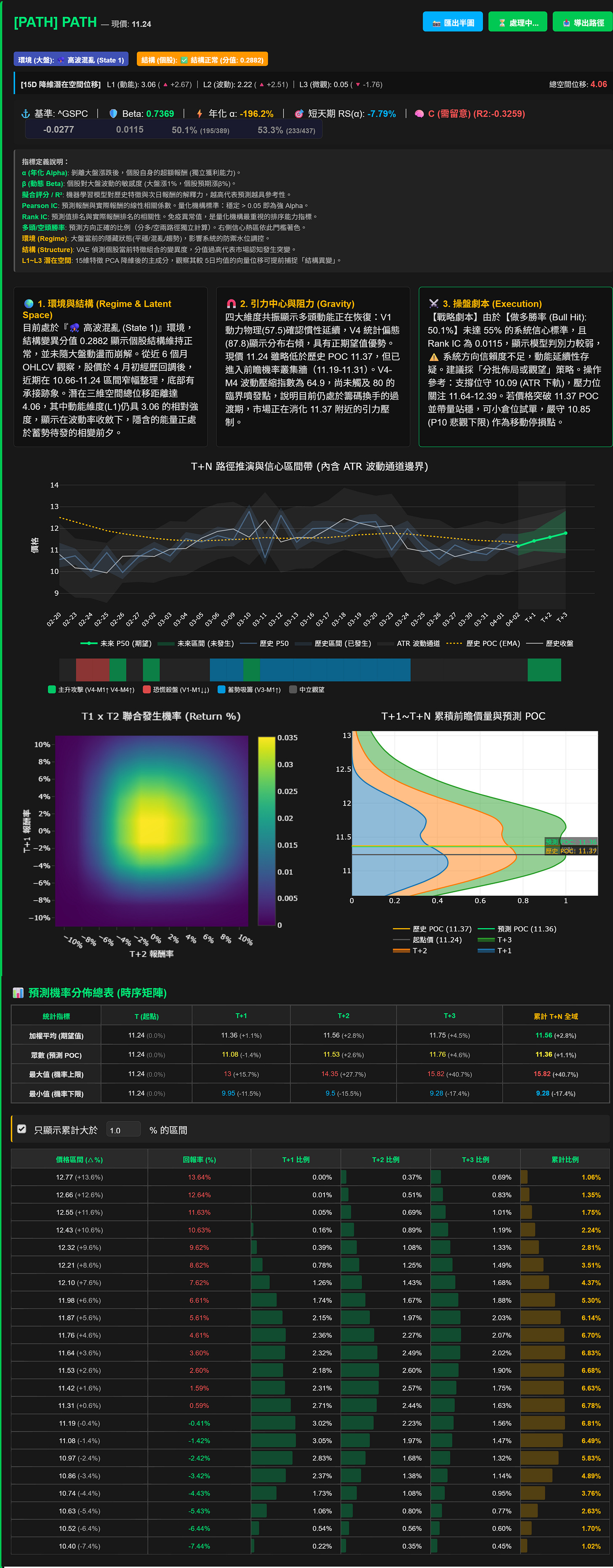 二、 空間重力感應:挑戰 11.37 元「引力牆」 在量化物理的視野中,POC (引力中心) 是決定路徑的核心。目前的 預期 POC 位於 11.36,而歷史籌碼密集區在 11.37。現價 11.24 就像是在引力場邊緣試探的小鋼珠。V4 統計偏態指標 (87.8) 支持了右傾分佈,這意味著一旦價格能有效帶量突破 11.37 這道牆,向上的期望值優勢將被釋放。