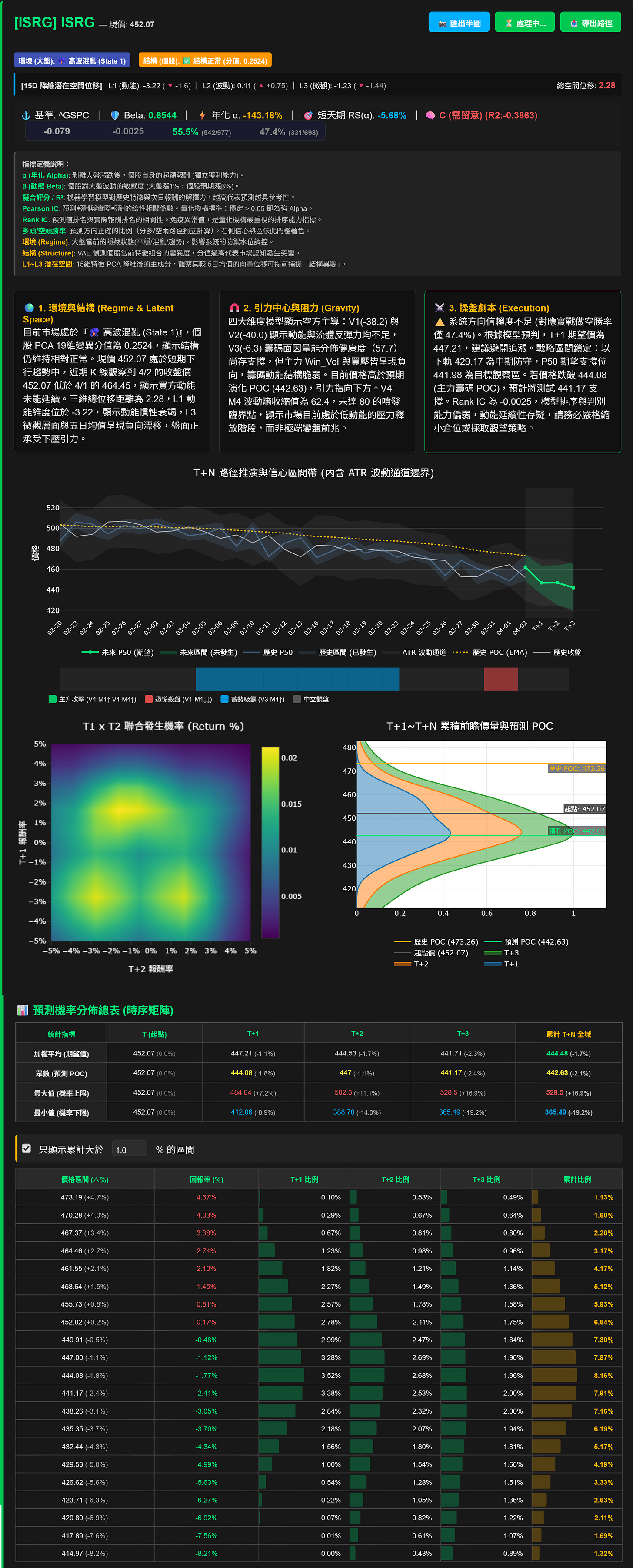 四、 雙重濾網的價值:勝率與 Rank IC 的紀律 儘管 市場新聞 可能仍在討論手術機器人的長期潛力,但我們的數據矩陣冷靜地指出:Rank IC 為 -0.0025。這是一個代表模型對當前走勢判斷力偏弱的訊號。在多頭勝率邊際效應遞減的當下,最核心的策略是「以守代攻」,緊盯 441.98 的期望支撐位。
