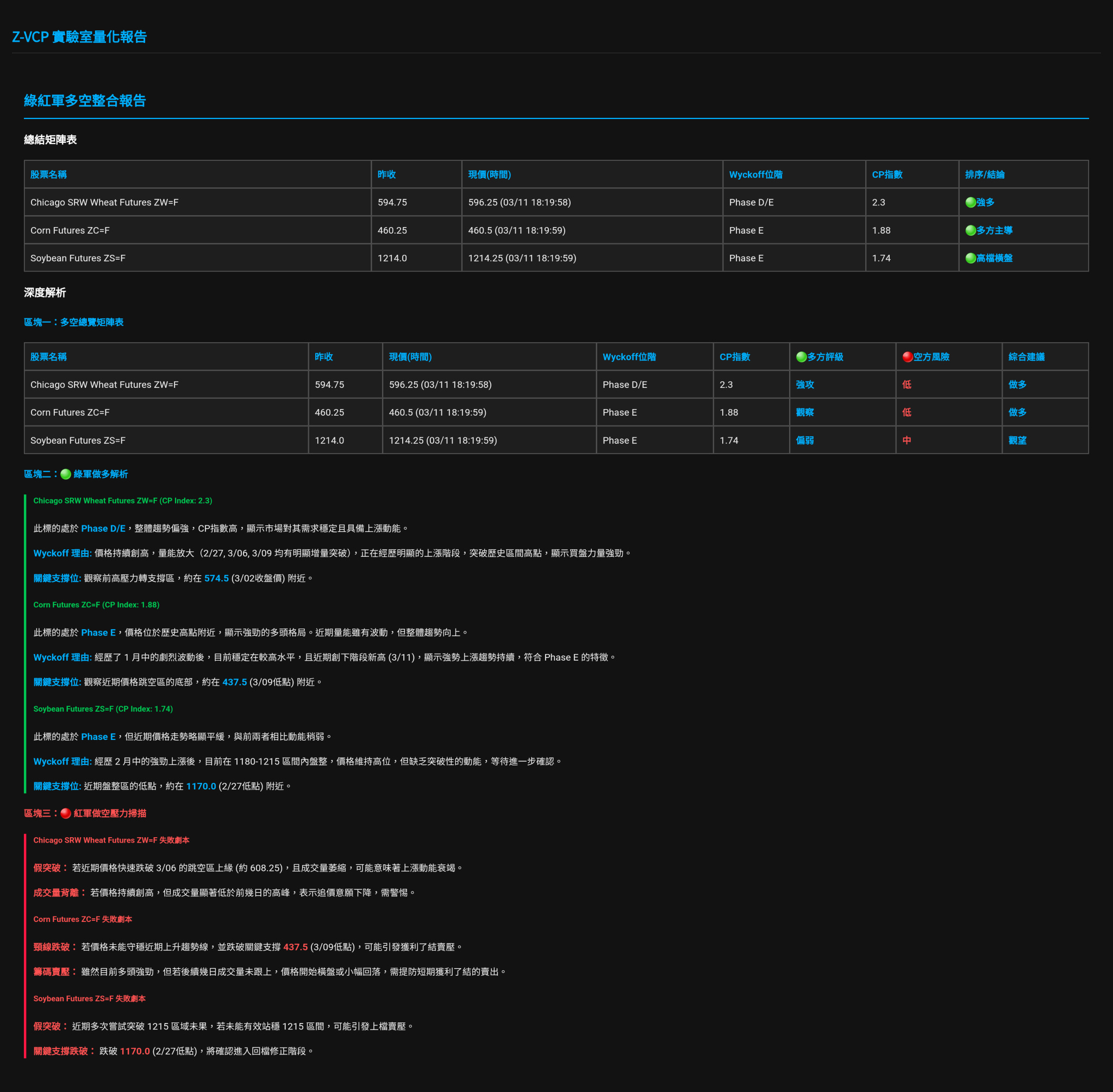 根據最新整合報告,黃豆 (ZS-F)、玉米 (ZC-F) 與小麥 (ZW-F) 的 Wyckoff 位階一致處於 Phase E(強勁上漲)。